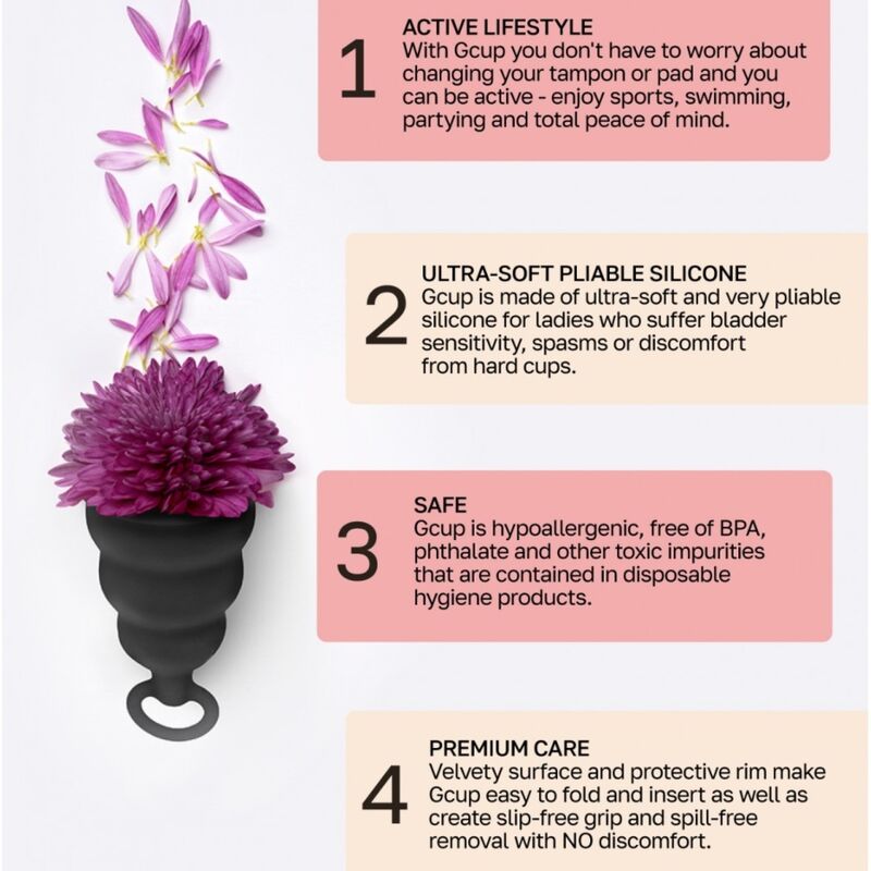 Le principal avantage et innovation de la Gcup est la structure interne. À l'intérieur du récipient se trouve un clapet anti-retour qui empêche le liquide de s'échapper. La coupe menstruelle Gcup est en forme de cloche, ce qui la rend facile à utiliser.